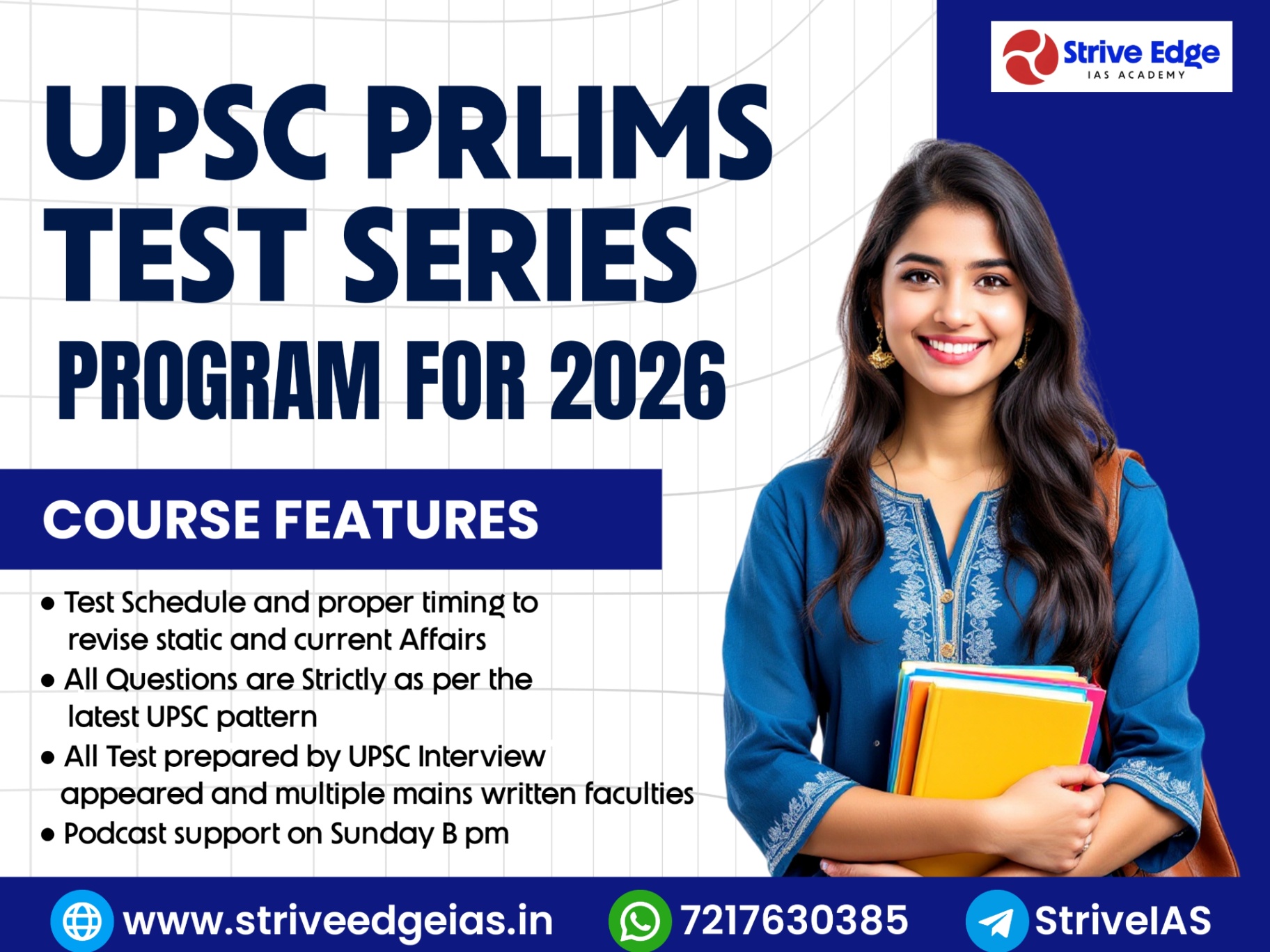 Features of UPSC Prelims Test Series 2026 : Tests: The series includes a total of 35 General Studies Tests (17 Basic Sectional, 8 Advanced Sectional, and 10 Full-Length Tests). Distribution: Polity: 4 Tests (3 Basic, 1 Advanced) Economics: 4 Tests (3 Basic, 1 Advanced) Geography: 3 Tests (2 Basic, 1 Advanced) History: 6 Tests (4 Basic, 2 Advanced) Environment: 4 Tests (3 Basic, 1 Advanced) Science & Technology: 3 Tests (2 Basic, 1 Advanced) Economic Survey, Union Budget, Major Government Schemes: 1 TestSectional Full Length Test: 10 Complete Syllabus Coverage : The series offers comprehensive coverage of the Prelims syllabus, with topics carefully selected by Prelims experts based on their exam relevance. Current Affairs Integration : The series integrates static topics with significant current affairs from the past 12 months, providing forward and backward intellectual linkages. Strive Edge Ias Academy UPSC prelims Test Series 2026 will be valid till 31st May 2026.
